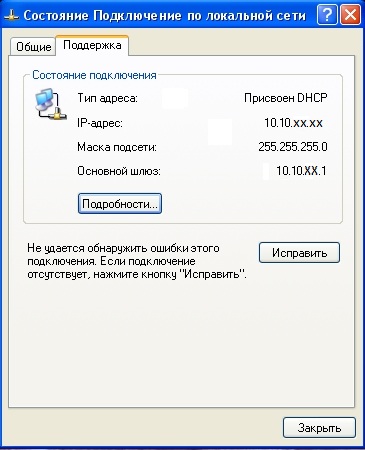 - Если IP-адрес не верный(при этом в System Tray может появляться Жёлтый треугольник), попробуйте нажать Исправить, а так же выключить и включить Локальную Сеть(либо перезагрузить компьютер).
