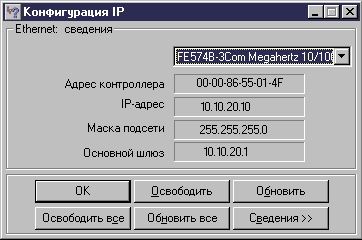 Выберите свою сетевую плату, зафиксируйте настройки: Адрес контроллера, IP - адрес.