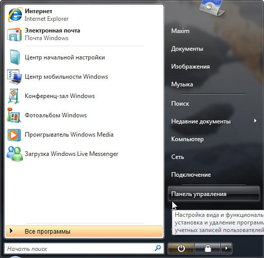 Нажмите кнопку "Пуск" и выберите "Панель управления"