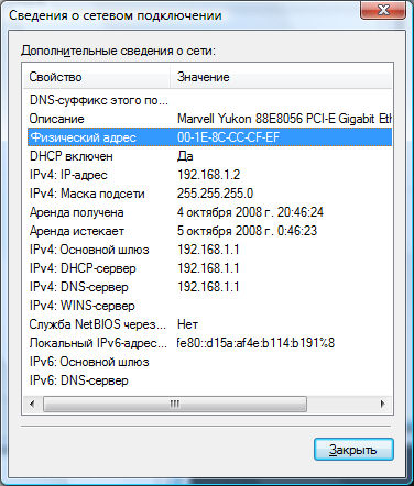 Зафиксируйте настройки: Физический адрес, IP - адрес